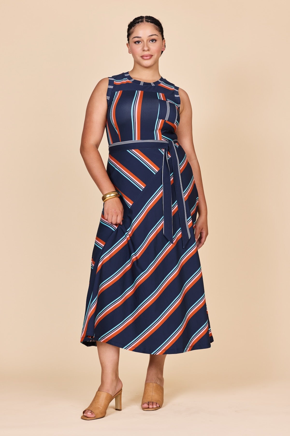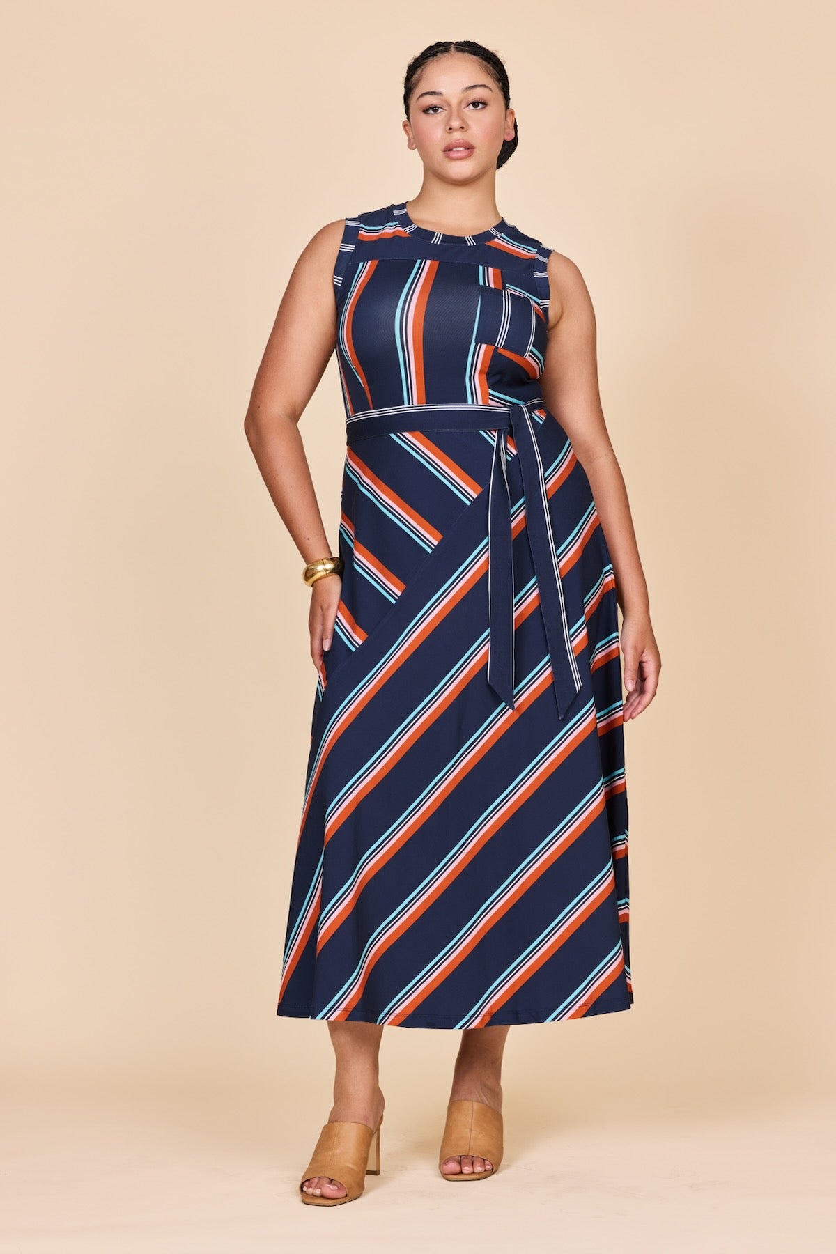 Diagonal stripes in navy, red and white bring instant drama with every step, while the sleeveless maxi cut keeps it cool and effortless.